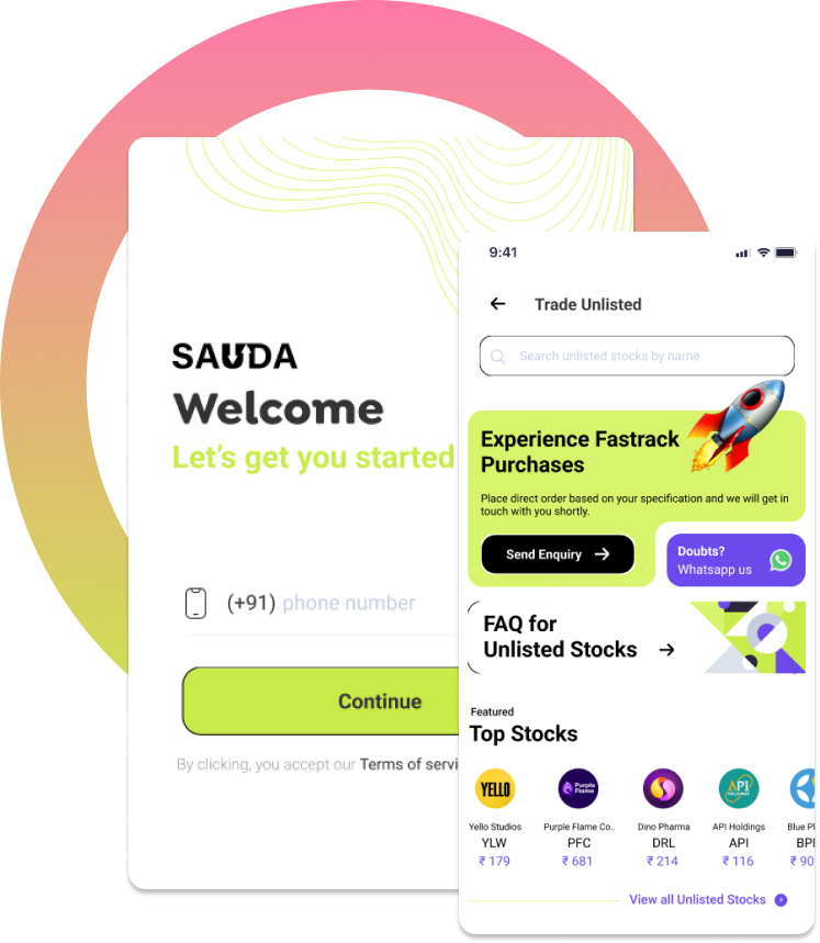 With Sauda, investors can effortlessly browse through India’s top unlisted companies, explore detailed insights, compare valuations, and trade securely within minutes. From startups shaping the future to pre-IPO giants gearing up for listing — Sauda connects you directly with tomorrow’s market leaders, today.